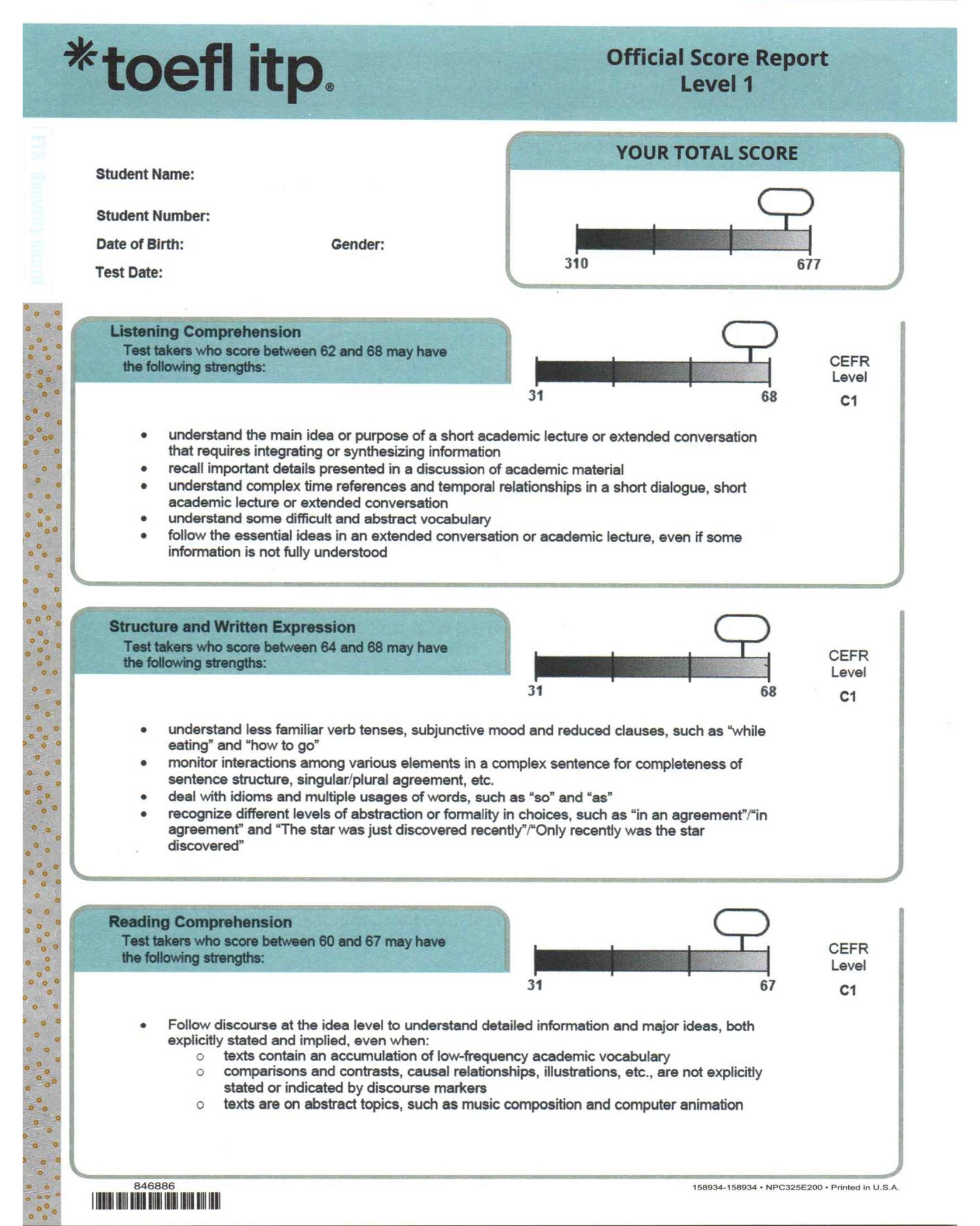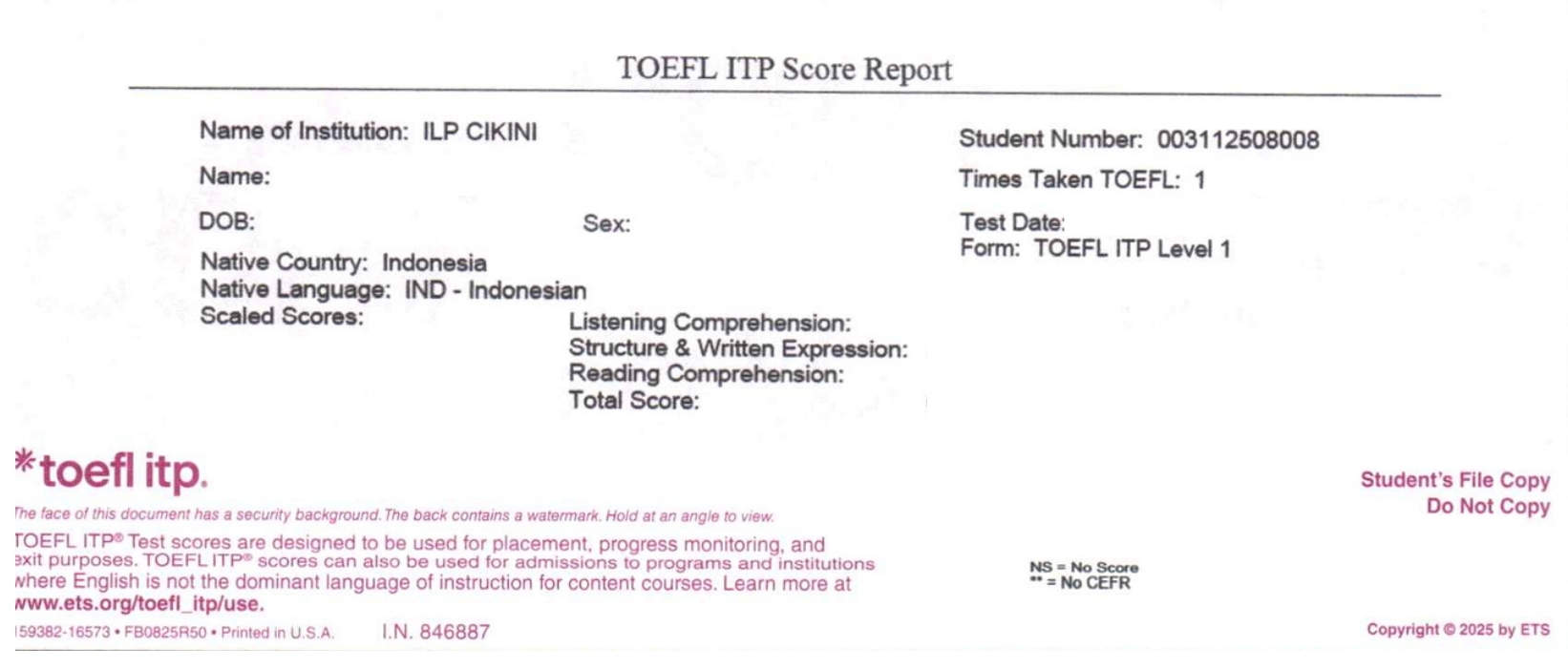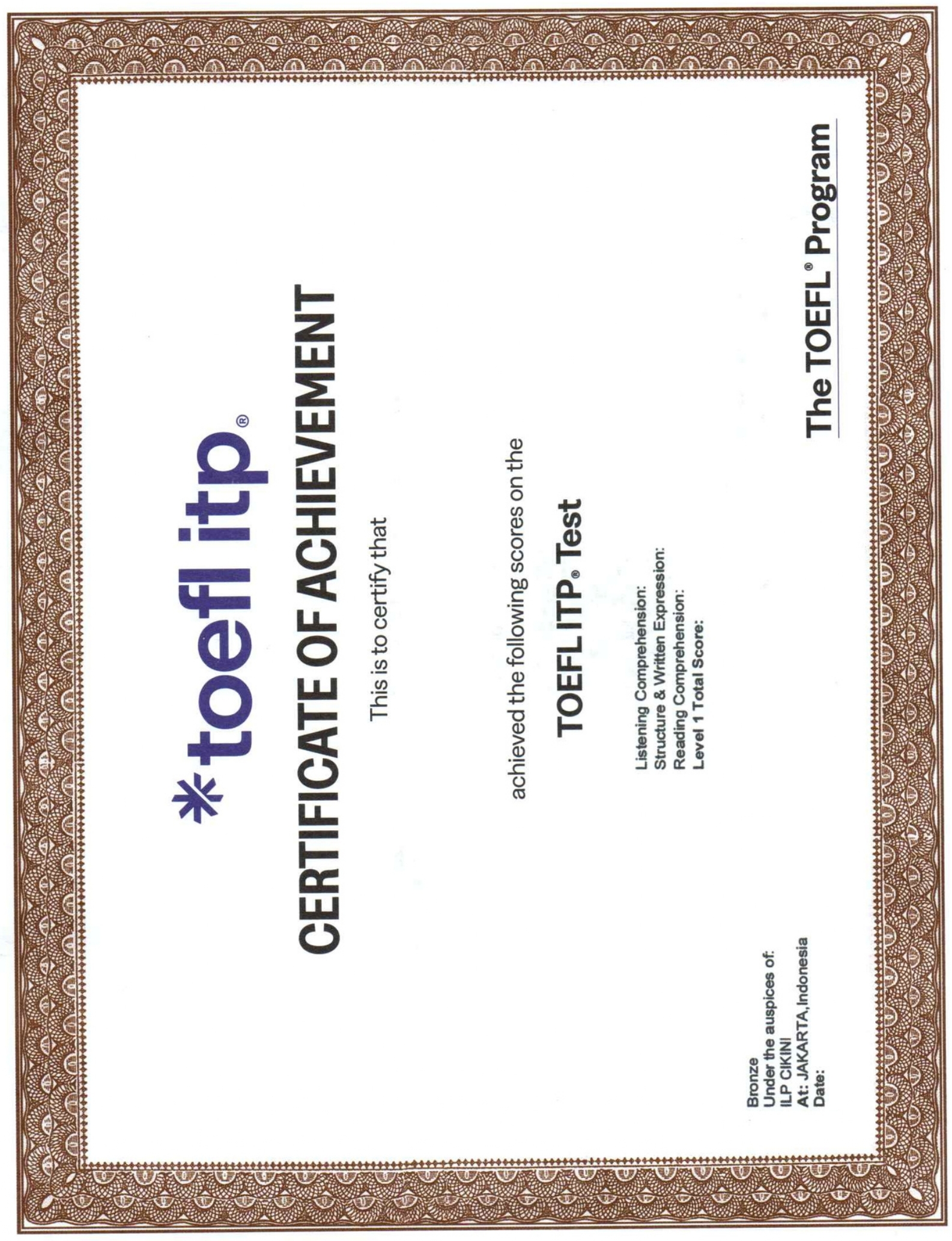 Skor ujian mempengaruhi jenis sertifikat yang akan diterima. Sertifikat TOEFL ITP berlaku selama 2 tahun sejak tanggal ujian. Sertifikat beserta score slip dan lembar CEFR akan tersedia di 10-14 hari kalender (bila tidak ada kendala dari pihak IIEF Indonesia).